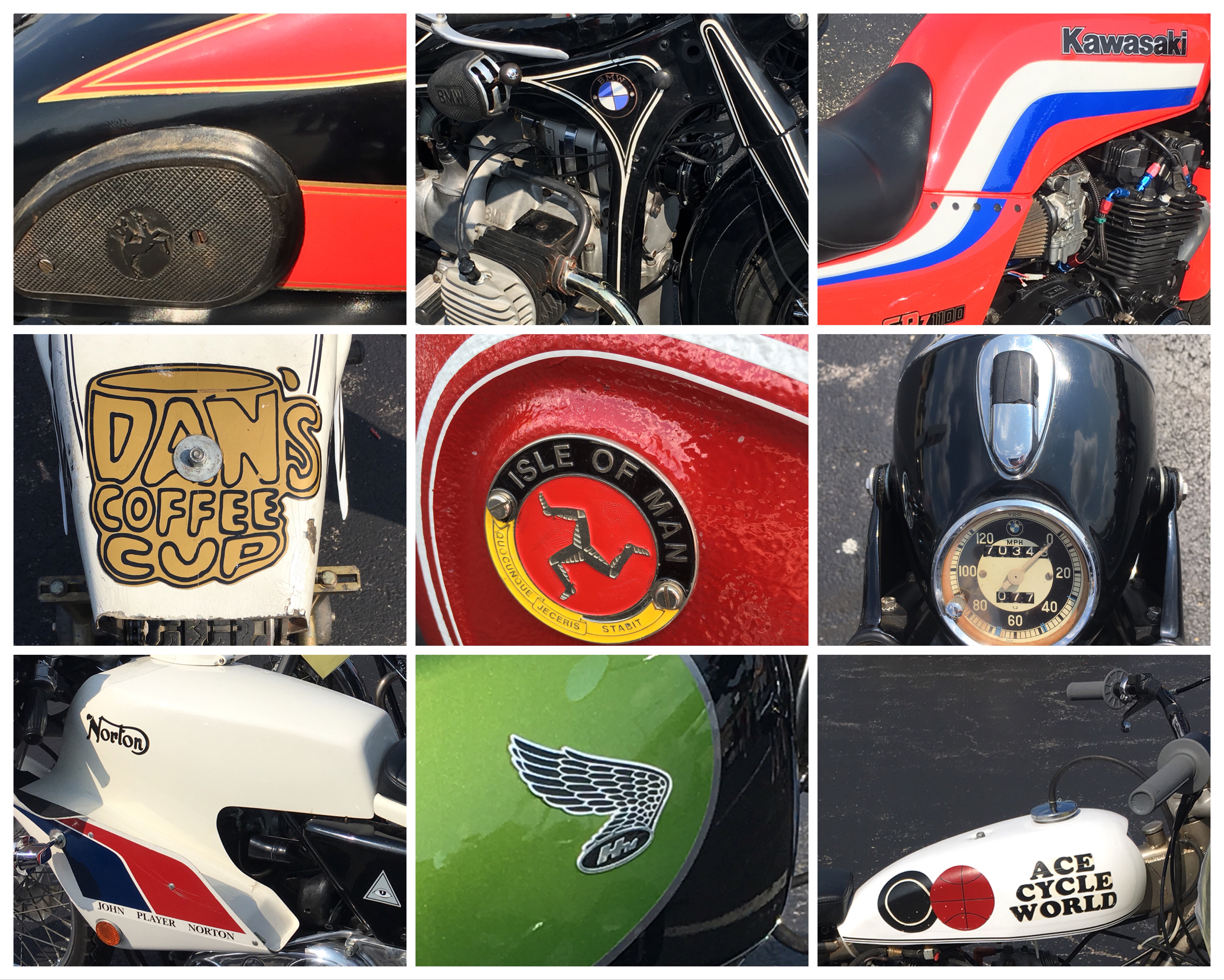 Close-Up – finishing off the week with some choice details of several motorbikes from last weekend. From Arial, Honda, Kawasaki, BMW, to Norton and Triumph. Some original, some personalized; from badges to pinstripes; tank, fairing, frame and fender.