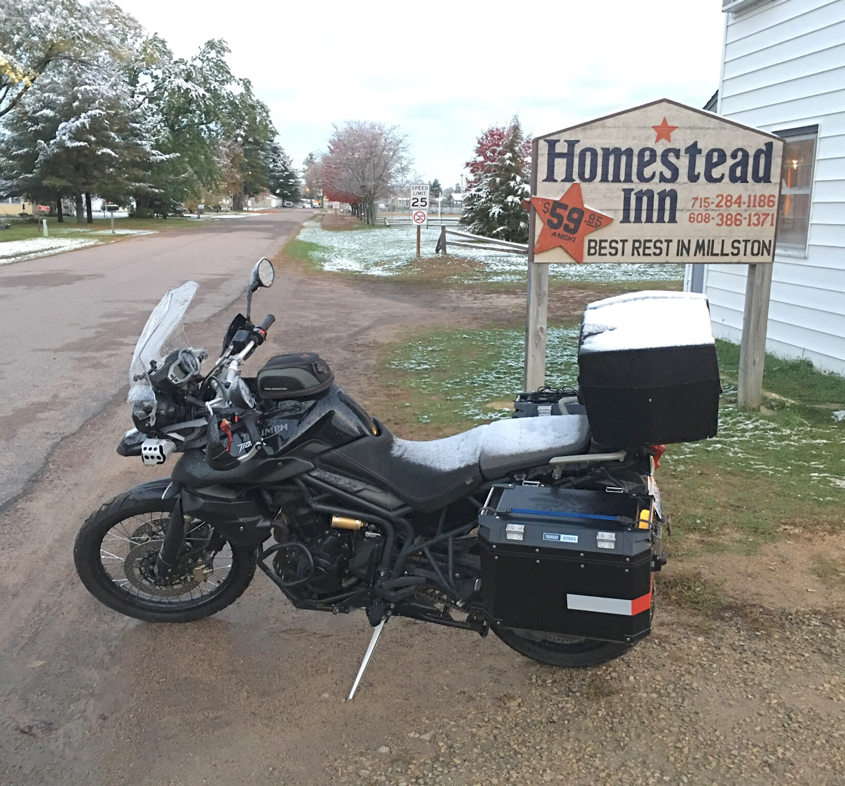 Early Start – the new day broke clear, though chill, with a bright low sun and temperatures in the mid twenties. The Tiger started easily and took her packs without a shred of notice. I stayed at the friendly Homestead Inn ($39.95 a night) being fed the promised fresh coffee and ginormous cinnamon buns made by the proprietress Mary. Wrapped up against the chill and a steady road home I made good progress back to Chicago. All in all 930 miles and 5 1/2 tanks of gas. Good outing with a huge variety of riding conditions.
