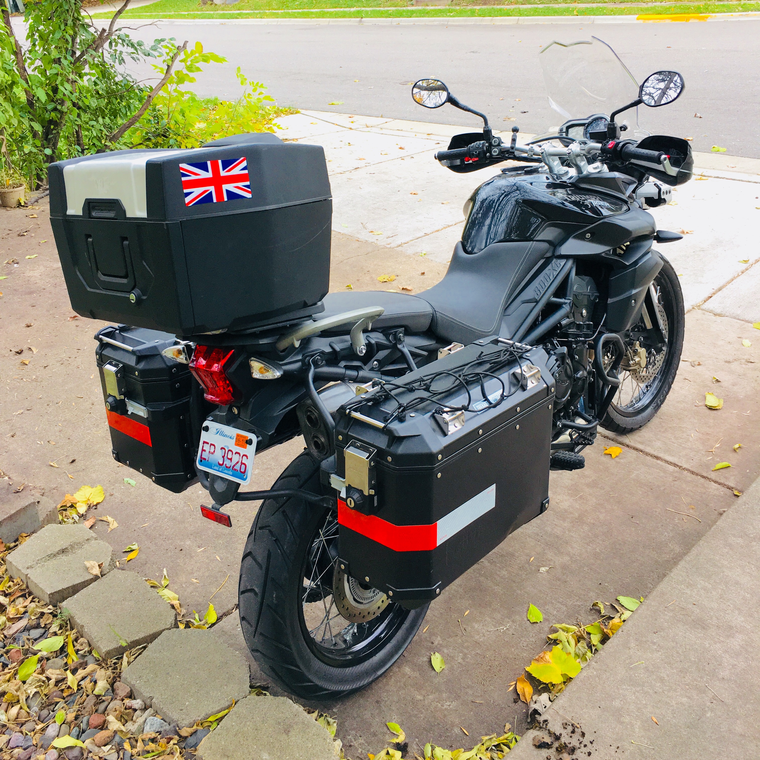Decal – for night time riding safety I added a pair of ultra reflective stickers to the cases. I want to make sure drivers see my rear end as I zoom along the Interstate at speed. There is a Union Flag added to the top case for patriotic dedication.