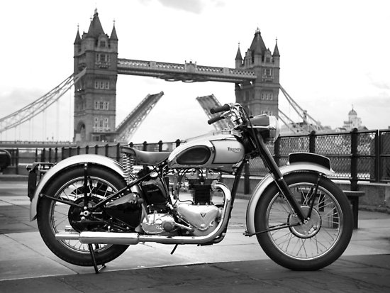Tower Bridge -stunning portrait of this iconic London landmark with a ’49 Triumph Tiger parked on south bank Butler’s Wharf near Shad Thames. The Tower of London’s White Tower can be seen in in the left background. The raised road deck bascules reach up like triumphant arms to the sky. I used to commute over this bridge when I lived in London. Most memorable moments were waiting for the spans to lower with other bikers at the front of the traffic queue.