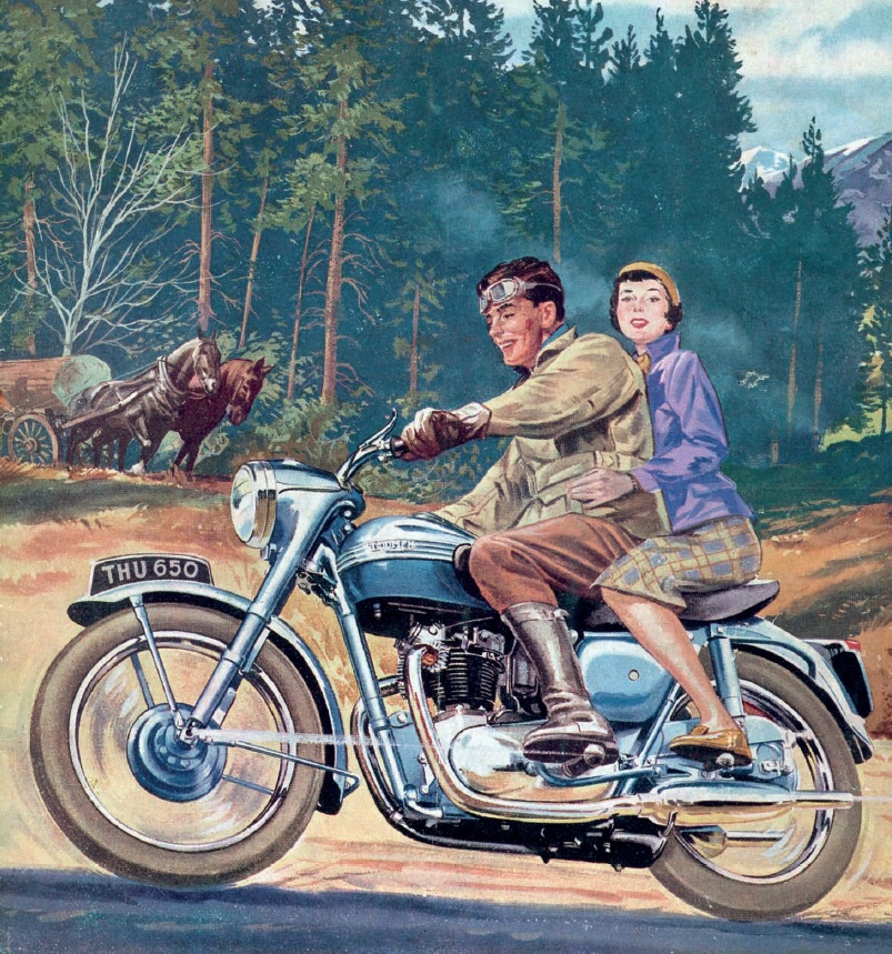 Rural Idyll – what better way to enjoy the bucolic surroundings of the countryside than aboard a blue Thunderbird. This classically illustrated image evokes so much enjoyment for a riding experience. “Pet! Let’s gan oot for a spin! I’ll waam the bike up; best put yor Tweed skort on it’ll be a tad parky!”