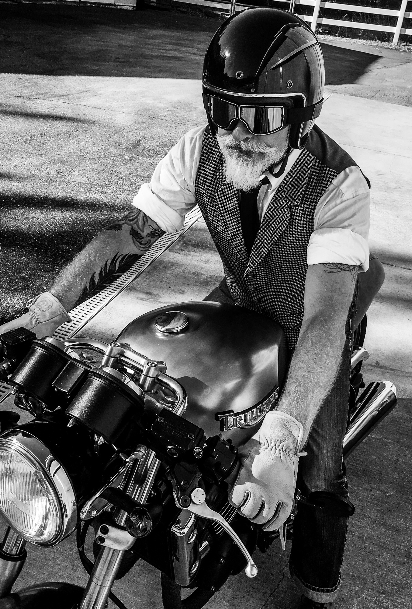 Dapper ‘n’ Dignified- here’s a chap looking quite at home leaning over the ace bars of his cafe’d Triumph. Good looking beard and shaped ‘tasche; which, along with the waistcoat, darkened goggles and slick half helmet, look perfect for the Distinguished Gentleman’s Ride that this fella was heading to.