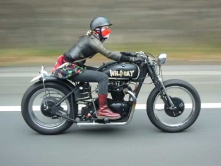Oxblood Docs – whizzing hardtail bobber being piloted by a bandana masked gal who wears jeans under her skirt. Badass! A Wild Cat indeed! Old time Triumph twin motor with a surefooted attitude.