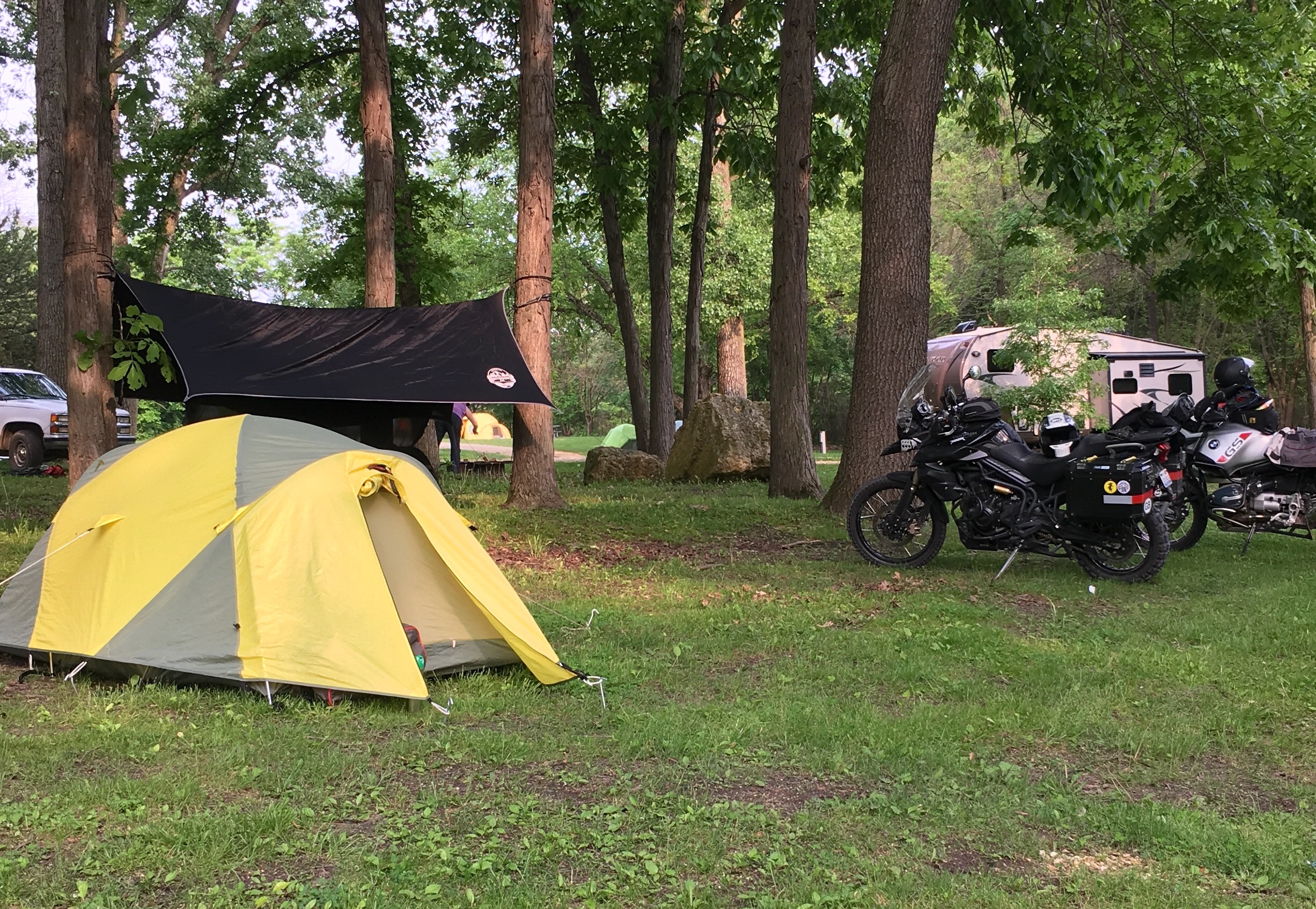 Tramping | That stands for Triumph camping. Here’s the tent set up at Blandings Landing on the Illinois side of the Mississippi. Rolling farmland interspersed with shady woodland connected by clean gravel roads. Good ride across the Northern part of the state along Stagecoach Road.