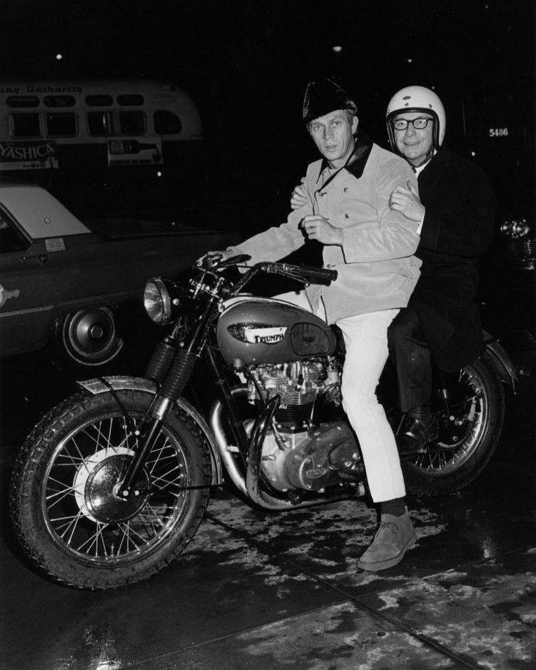 Pillion Who? | We’re not sure who this is as passenger with Mr Steve McQueen… but if he’s racing around the Hollywood Hills like the two-wheeled fanatic he was then this gent had better hold on! Answers on a postcard to BBC TV Wood Lane London W12 8QT