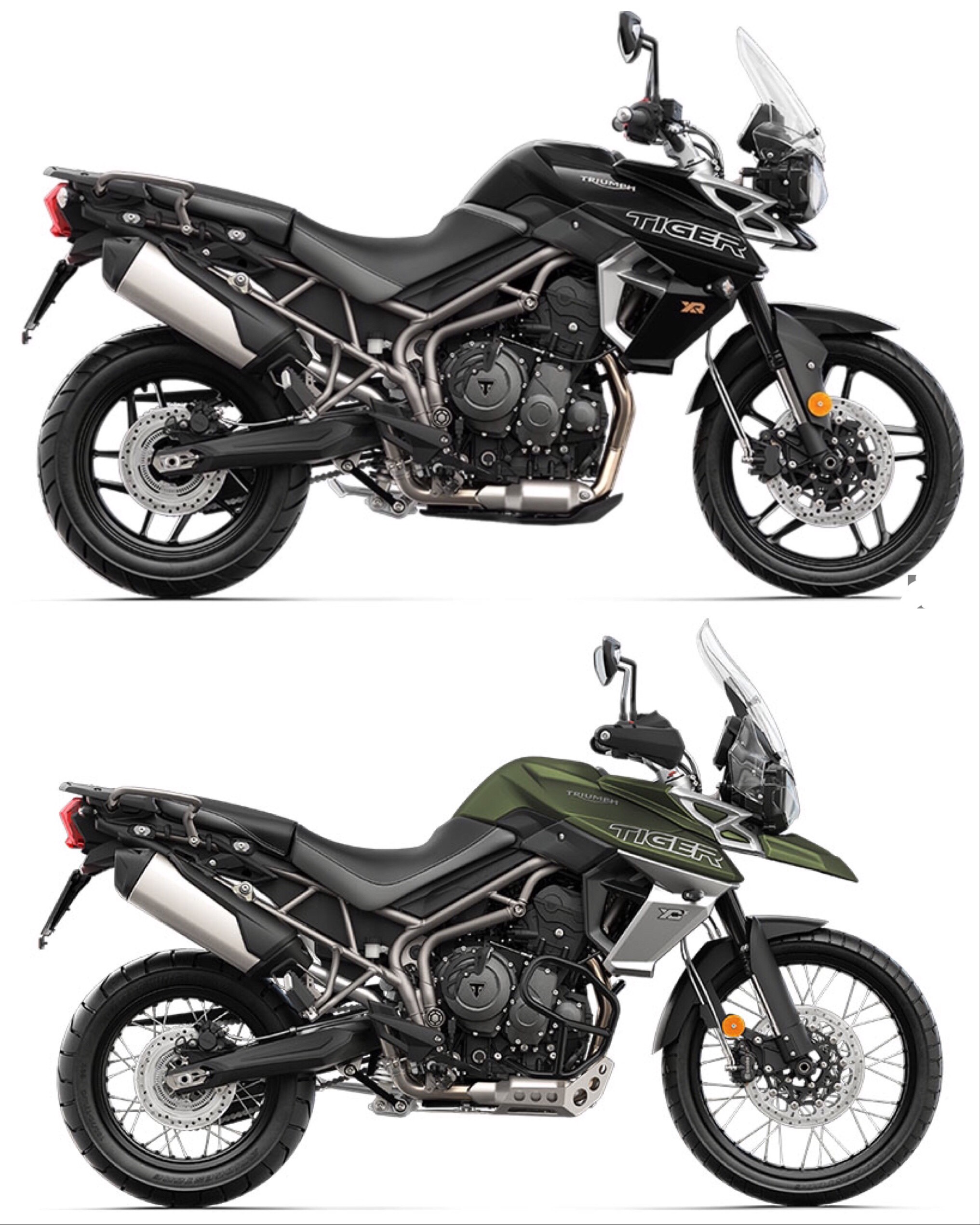 On/Off Road | Here are the two main models of the Tiger 800. XR and XC. As well as the wheel differences the other major distinction is the beak: short on the road like a parrot and long on the off road version like a kingfisher.