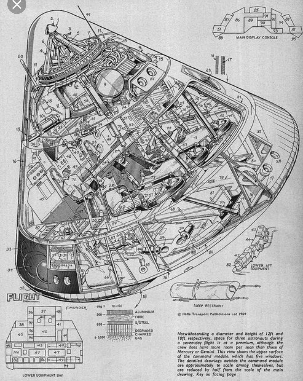 Moonship Cutaway | beautiful technical illustration of the Command Module. The three astronauts traveled to the moon and back in the claustrophobic confines of this vessel. Though in zero-g it became very slightly more voluminous. They also had the Lunar Module which was docked to the nose of the LM for more elbow room. The CM is the only piece of hardware that made it back to earth.