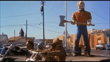 Muffler Man | frame from opening scenes to Easy Rider depict a looming Ax Man. These fiberglass behemoths advertised car mufflers in the sixties but we’re sometimes repurposed for other city symbols. Typically a silencer would be supported between the giant paws of the lantern jawed gargantua – but other items can be substituted too, such as the double headed axe that this chap is wielding.