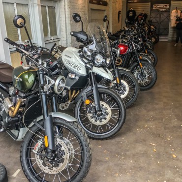 Line Up | A healthy looking range at the Triumph showroom in Motoworks shop. The current models are each worthy of the accolades they are receiving. One diamond jubilee Bonneville special looked particularly pleasing with polished engine covers and a pearly Union Flag wrapping the tank.