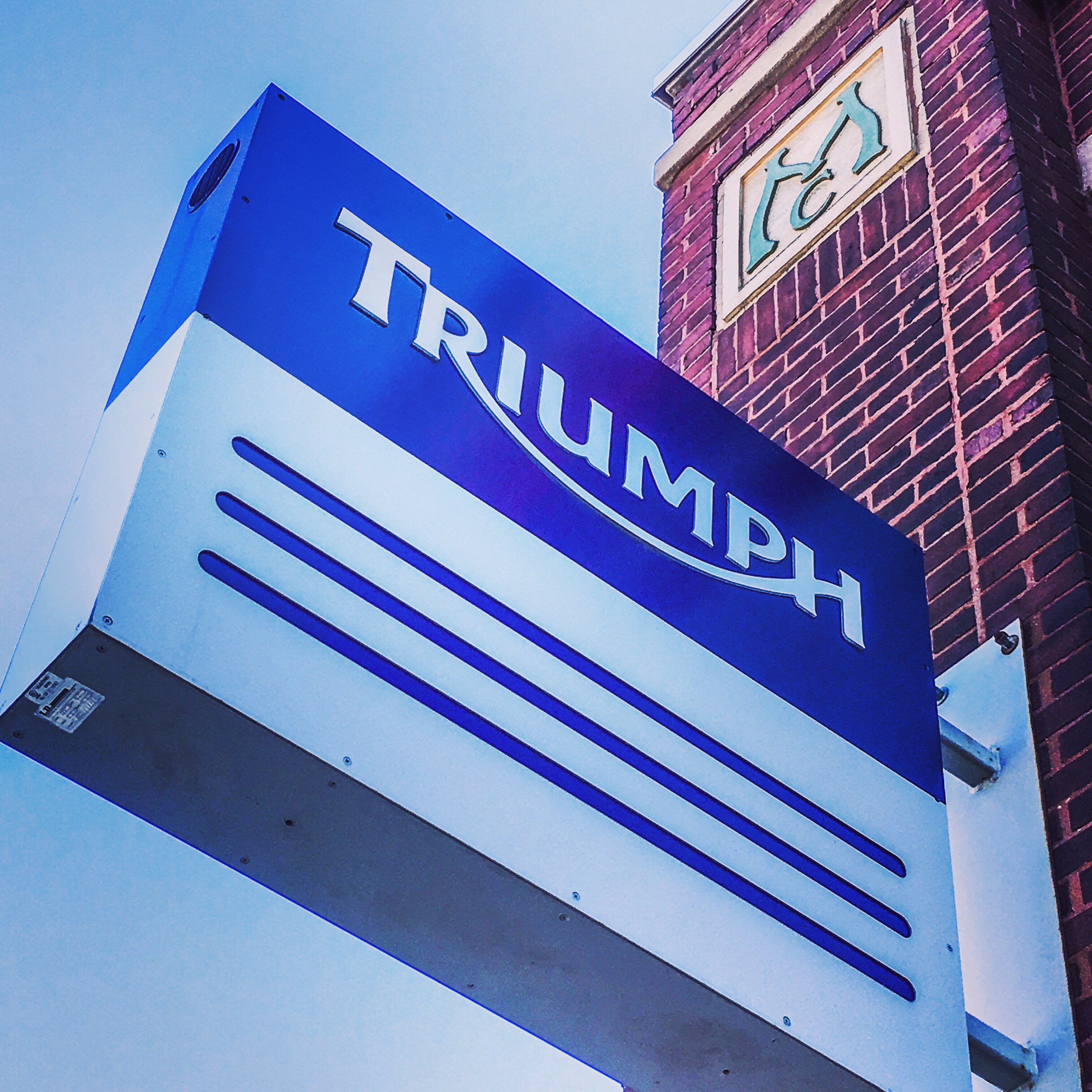 Shop Banner Sign | Blue logo with three stripe icon below it. Good clarity of branding easily seen at 1901 S Western Ave. Chicago. The three stripes hark back to Turner days and the tank badges of the fifties Speed Twins. The building motif is appropriate too: M.C. For motor-cycle.