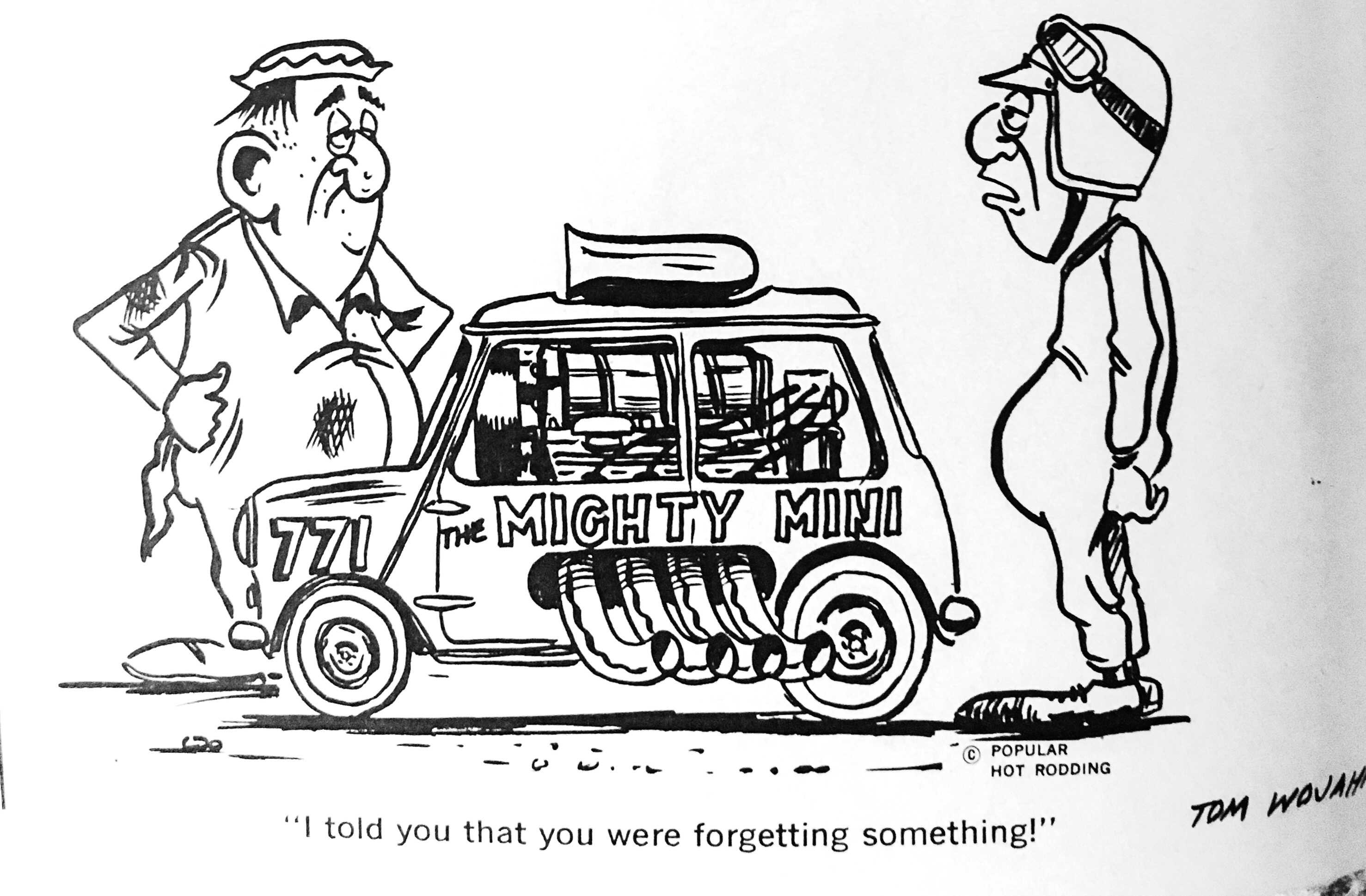 Hot Rodder July 1966 | a ‘toon clipping from a vintage magazine unearthed in Minnesota. If you try and drop a Chevy small block V-8 into a Mini Cooper you’d better think about the pilots cockpit.