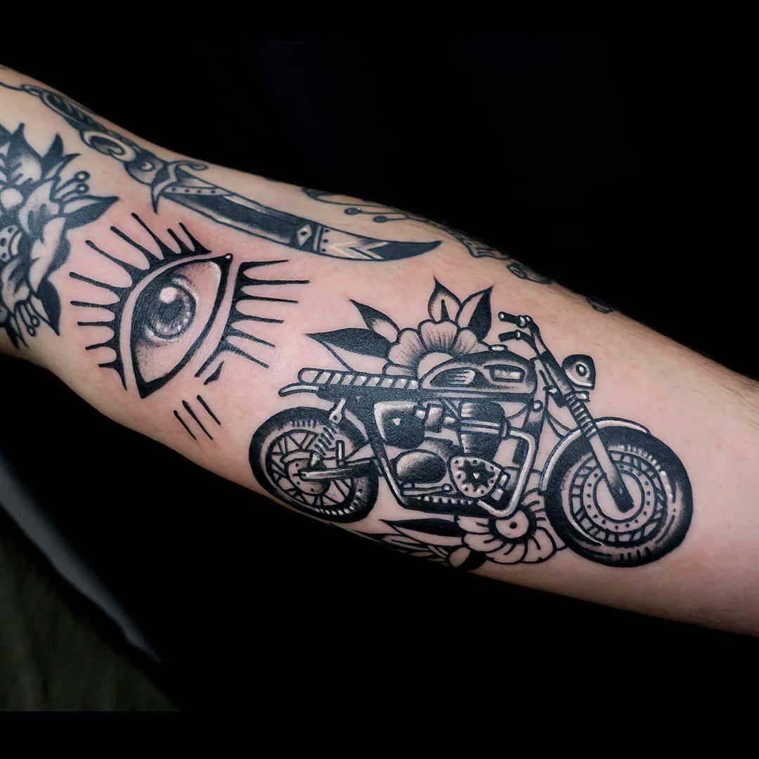 A Farewell to Arms | motorcycle tattoo in a Sailor Jerry style. Heavy ink graphics show off the classic lines of a Bonneville. The flowery backdrop flavors the image up.