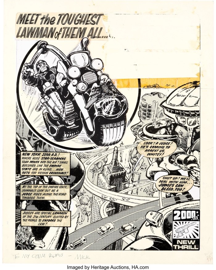 First Spread | Prog 2 March 5 1977. This is when Judge Dredd burst out of the page on his Lawmaster. Fine illustration by the unmatchable Carlos Ezquerra, who created the original look of the Judge’s, though the remainder of the strips pages were drawn by Mick McMahon who was to further refine the Dredd look over the following couple of years.