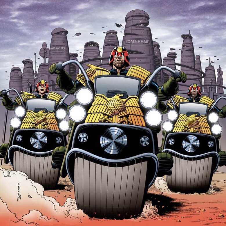 Let’s Roll! More future cop adventures. This time drawn in the impeccable line work of artist Brian Bolland. Mark 1 Lawmasters aimed directly for the viewer. Blocks loom under a moody sky in the background.