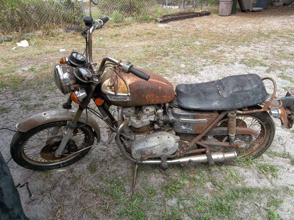 More than an age worn patina, this mid seventies Bonneville has been weatherized under decades of barn rafter dust and farm critter nesting. It may be past any level of recovery with an appearance of disintegration into its constituent ferrous and alumina atoms.