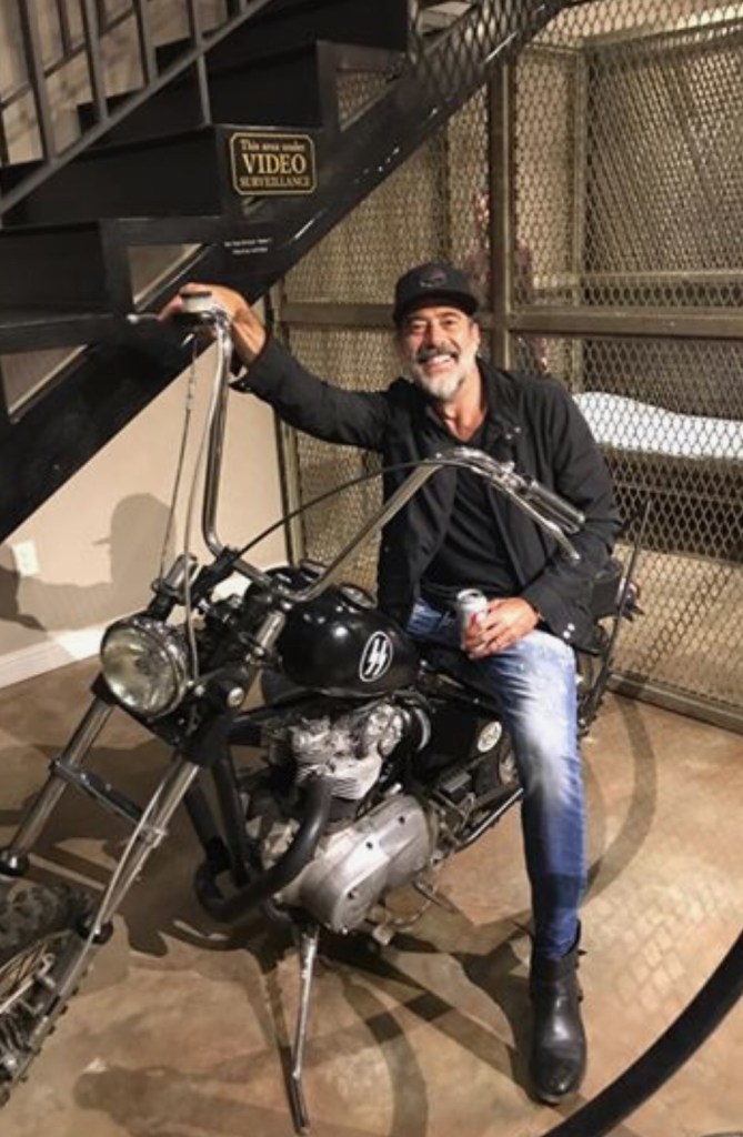 – We just finished watching season nine of The Walking Dead. The bad guy you love to hate, Negan, played with a constant Cheshire Cat grin by Jeffrey Dean Morgan, is here seen sitting on Daryl’s first Triumph engined chopper from the show.