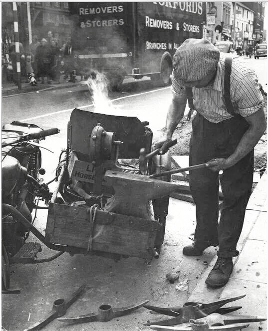 The blacksmith was history’s mechanic and tire shop. They shod horses, fabricated machinery and repaired tools. With the advent of the internal combustion engine they had to adapt to newer technologies. This blackie has utilized a motorcycle combination to haul around a portable forge with anvil. You can hear the ring of the heavy ball peen hammer.