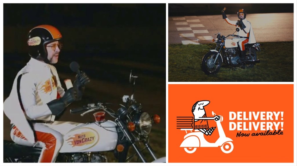 – the current advertising campaign for Caesar’s Pizza involves a caped daredevil under a spotlight ready to perform motorcycling derring do. The bike is a Triumph just like Evel Knievel used in ‘67 to jump the fountain at Caesar’s Palace in Las Vegas. Extra cheese topping please!