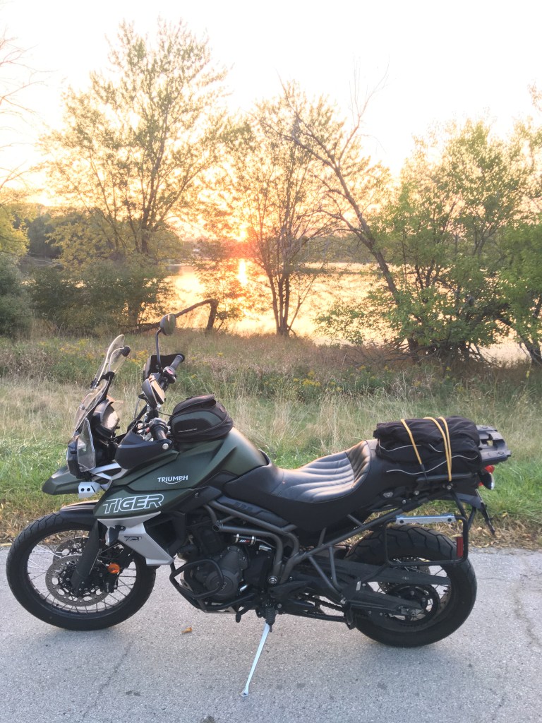 – a luminous early evening ride with a fresh autumnal atmosphere. Setting orb of the sun drops behind the fading foliage. The Tiger carried me effortlessly into the dusk.