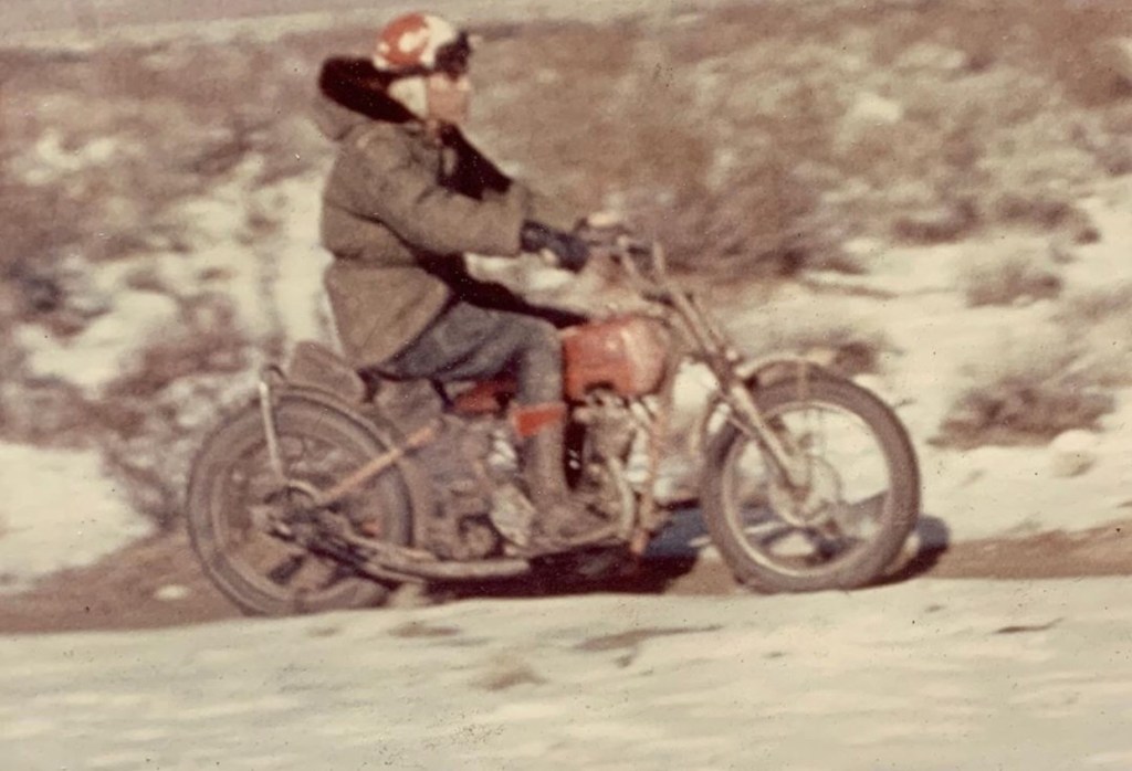 – Hardtail iron being give a steady pitch through the scrubby high desert in the sixties. Shin-high engineer boots and hooded parka are useable garb for the dry cold climes of the open lands.