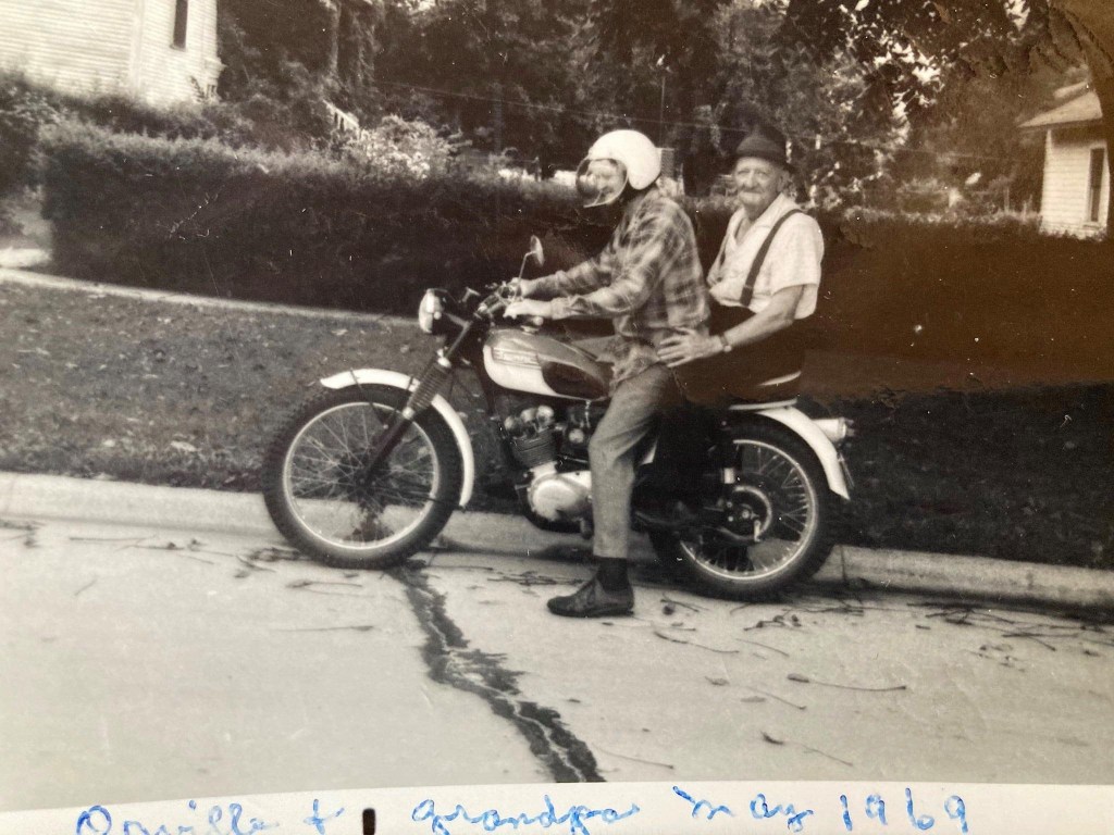 – neat old image of a proud Triumph Mountain Tiger Cub owner, Orville, taking his grandfather for a spin.