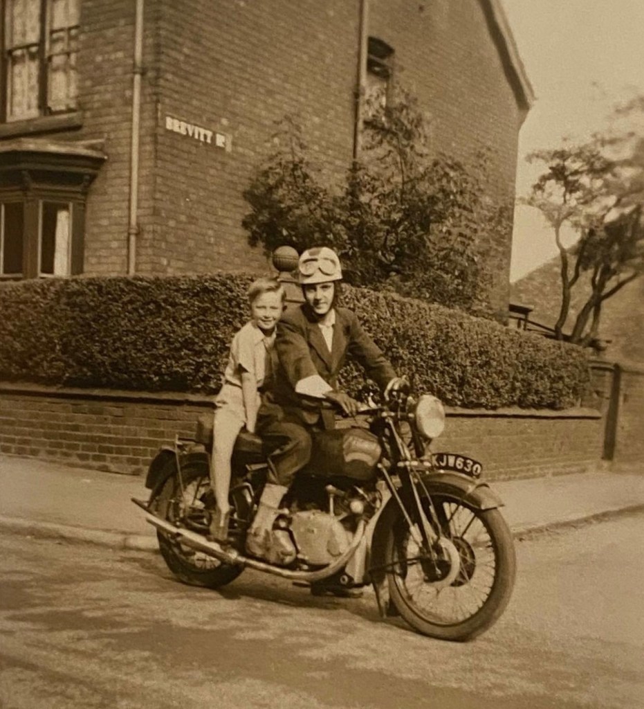 – old pic from a bygone era. Vincent owner sits proudly with a lucky young lad on the corner of Brevitt Road and Wanderers Avenue in the Midland city of Wolverhampton. The penny loafers with trousers tucked into the socks are quite a look. Probably just going to pop down to get some milk for the tea…