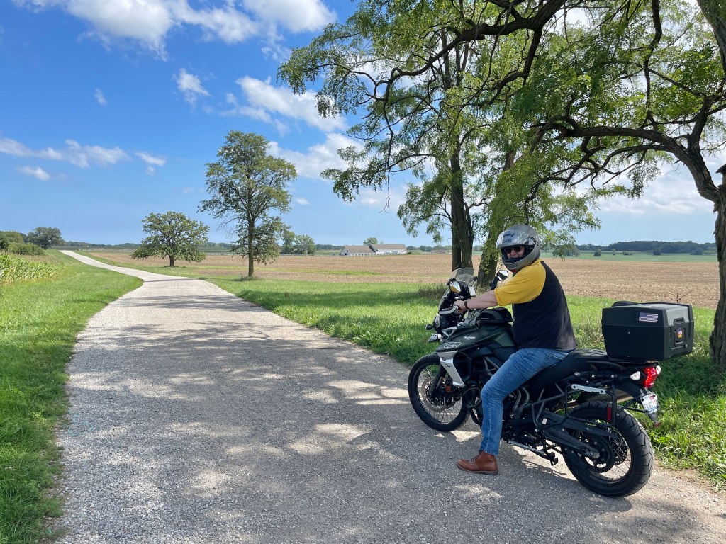 – perfect weather allowed us to explore a few more back roads through the agricultural setting of Lake County. This gravel lane in particular was especially inviting. Shoulder height corn field to port and fallow arable to starboard. White farm building clusters ahead.