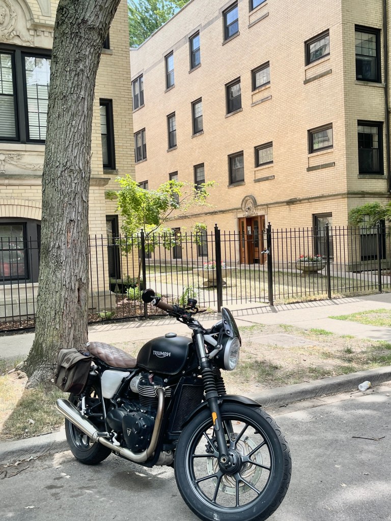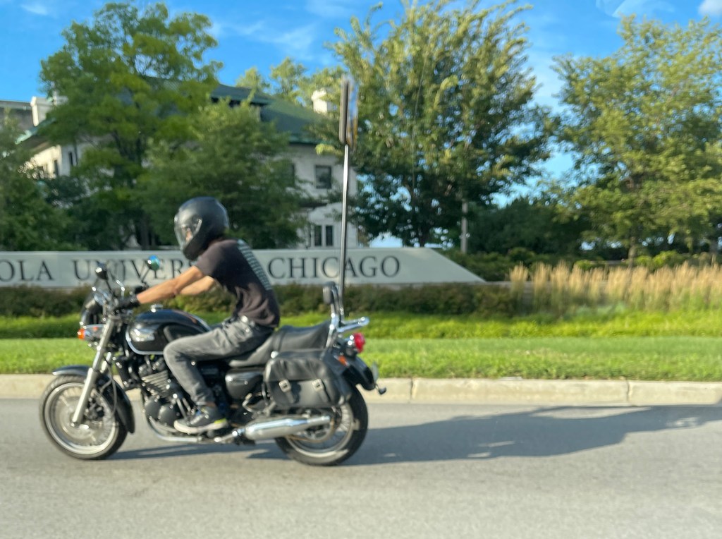Taking the curve on Sheridan Road as it passes the seminary college on the lakefront. This lad is enjoying the sunset turn-in on his nineties black Triumph.