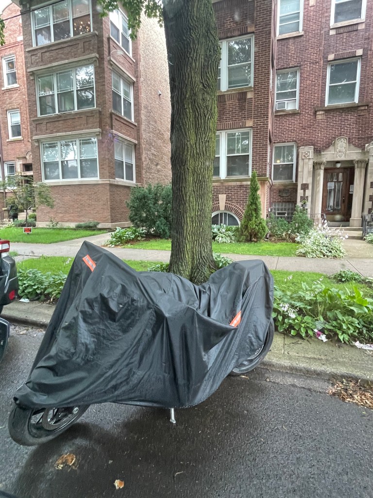 . And a spot of rain is called for. The extreme heat in the UK and Europe need the cooling effects of inclement weather. Having learned to ride in the rain I’m not shy to get out in the wet. You just need a little extra care on the corners or freshly rained upon roads. This motorcycle covered and parked in the City is ready for action dry or wet.