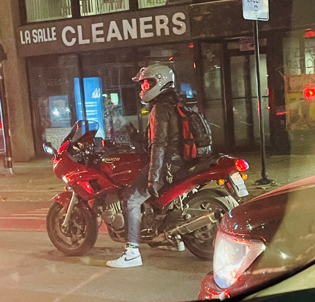 Spied on Chicago Avenue this evening. A solid machine being enjoyed on a balmy November evening. It had a pleasant throaty rumble. Nike basketball boots are period perfect too!