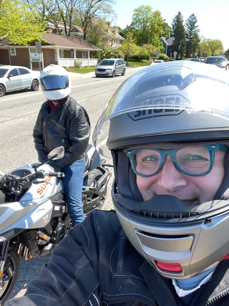 Lovely weather today so a nice ride out to the Fox River Valley was enjoyed. David has a new Suzuki Katana detailed in homage to the early 80’s Katana. Gorgeous throaty growl from the exhaust and a lovely looking machine. Trees verdant with new leaves and spring bloom aplenty to thrill the dull winter tired eyes. Smashing just.