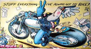 Wise words in the current misshapen world. Ogri, the leather jacketed, helmet wingéd, rocker who tears around on his caféd Norvin, was created by Paul Sample for Bike magazine in 1972. Sadly Paul passed this week and I also remember his book covers for Tom Sharpe’s hilarious works such as Blott on the Landscape, or Wilt. But Orgi with sidekick and bumbling Malcolm; ragged pup Kickstart; and on and off girlfriend Mitzi; is a long standing comic trove. RIP Paul Sample 1947-2026