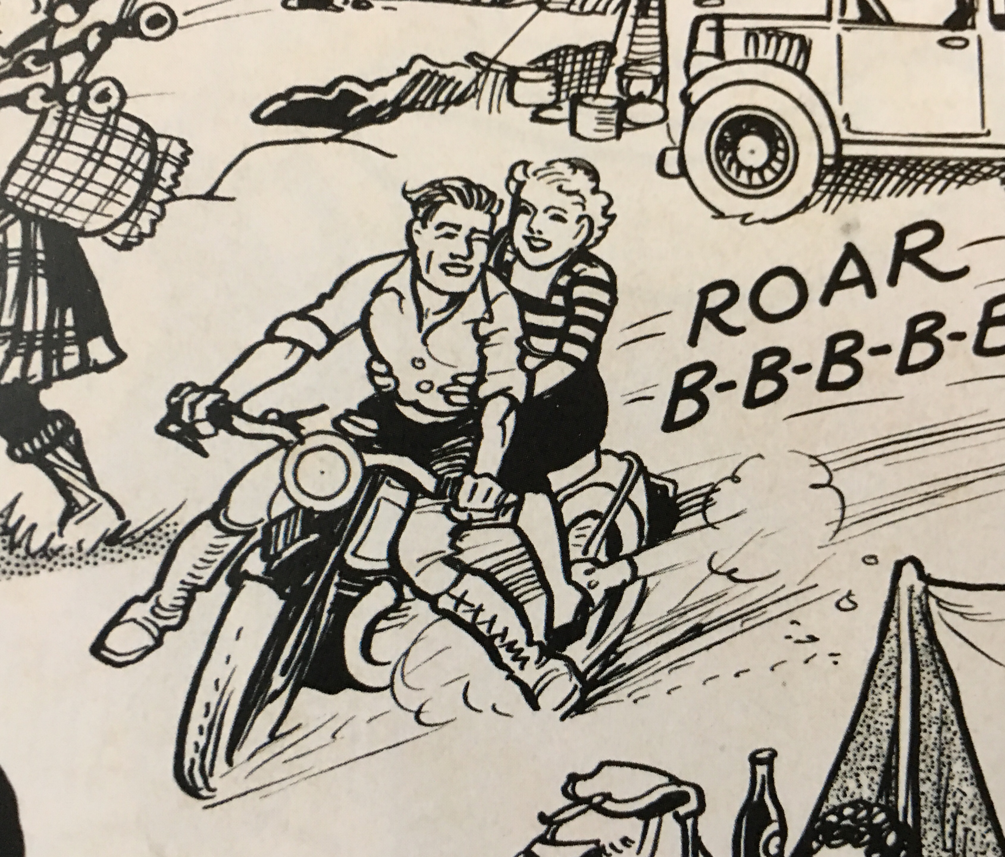 Sunny Smile – someone’s girlfriend sitting astride their pride and joy. Late Thirties Triumph Speed Twin 5T with girder forks, rigid rear end and only available in the luscious amaranth red. These were in production until the 14 November 1940 when the German bombing of Coventry led to the destruction of the Triumph factory. An order of thousands of military spec 5T’s were destroyed as well as all of Triumph’s technical records, drawings and designs. Post War an updated 5T helped rebuild Triumph to become the worldwide leader for another couple of decades.