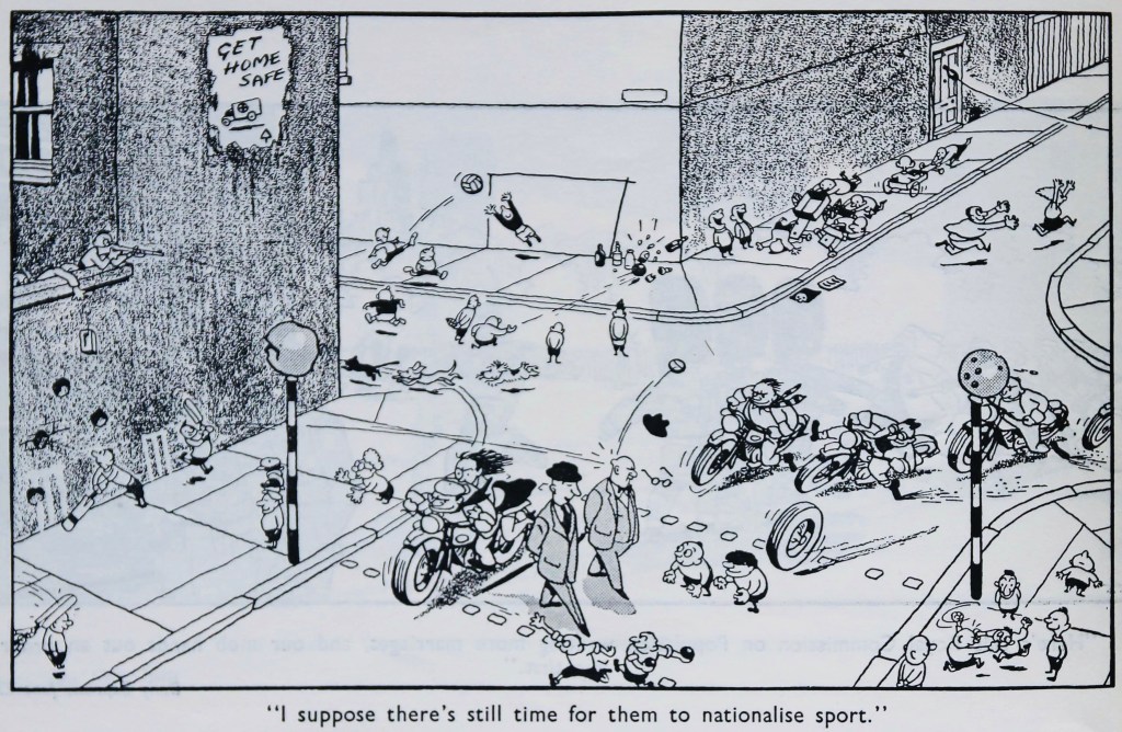 I love the work of Carl Giles, simply known as “Giles”. He added topical visual fun to the Daily and Sunday Express from 1943 to ‘89-‘91. His annual collections were a regular Christmas present for my father. Though left leaning in politics he said he earned a good income from the right wing Express. As well as the contents of my weekly comic 2000ad, I also drew the scenes and characters in his strips.