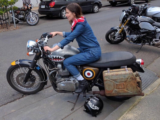WAAF – Women’s Auxiliary Air Force, furthering our WW2 flight theme look at this tiger gaped Bonneville. Jerry can pannier is a appropriate detail, and the big wartime yellow ringed roundel seals the deal. As they say: ” Smoke me a kipper, I’ll be back for breakfast!”