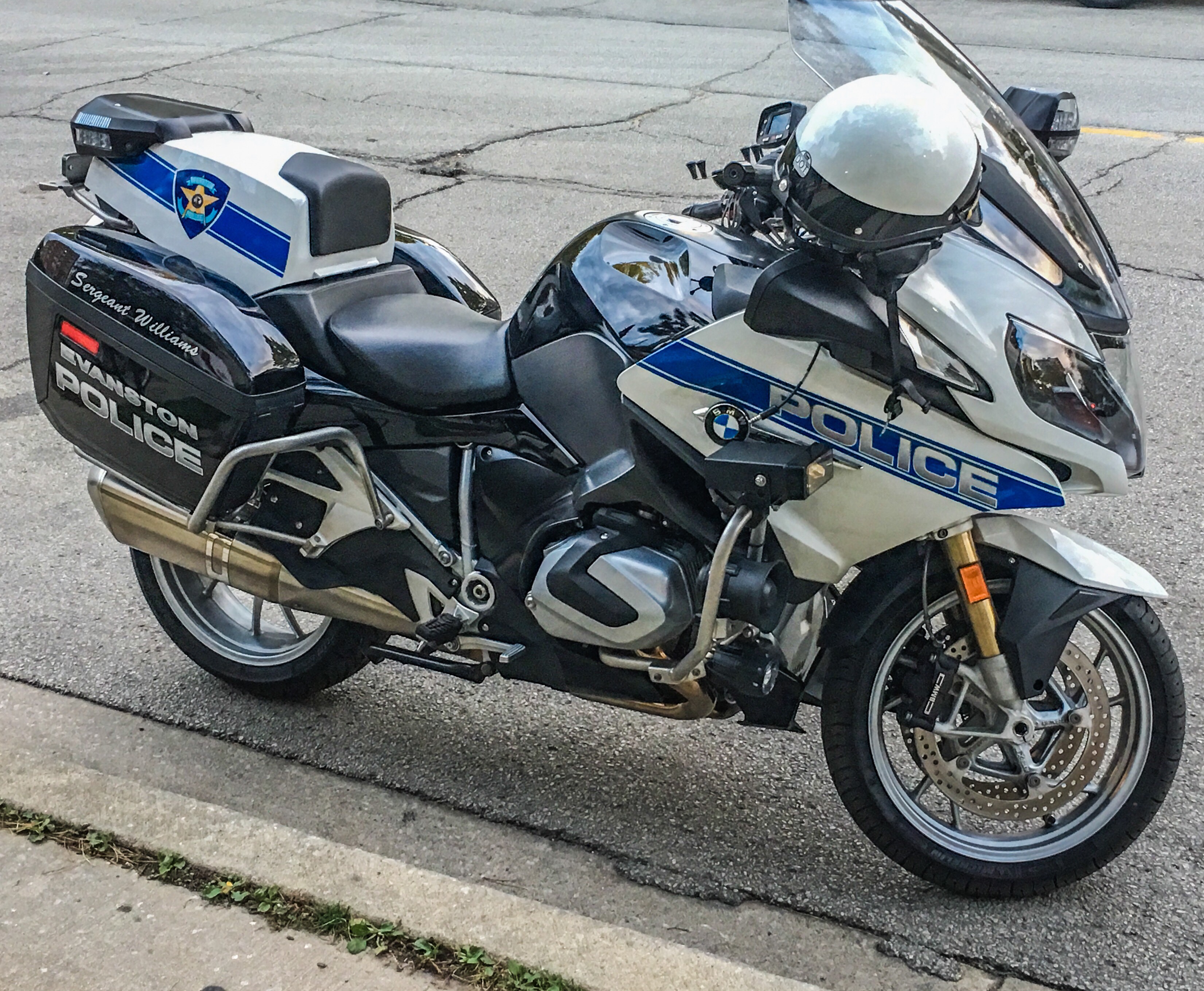 Highway Patrol | The City of Evanston’s police department has shiny new scooters. Fully kitted Beemer ready to light the blues and twos and apprehend speeders on Ridge Avenue, where the speed limit is 25mph. Very smart looking hauler.