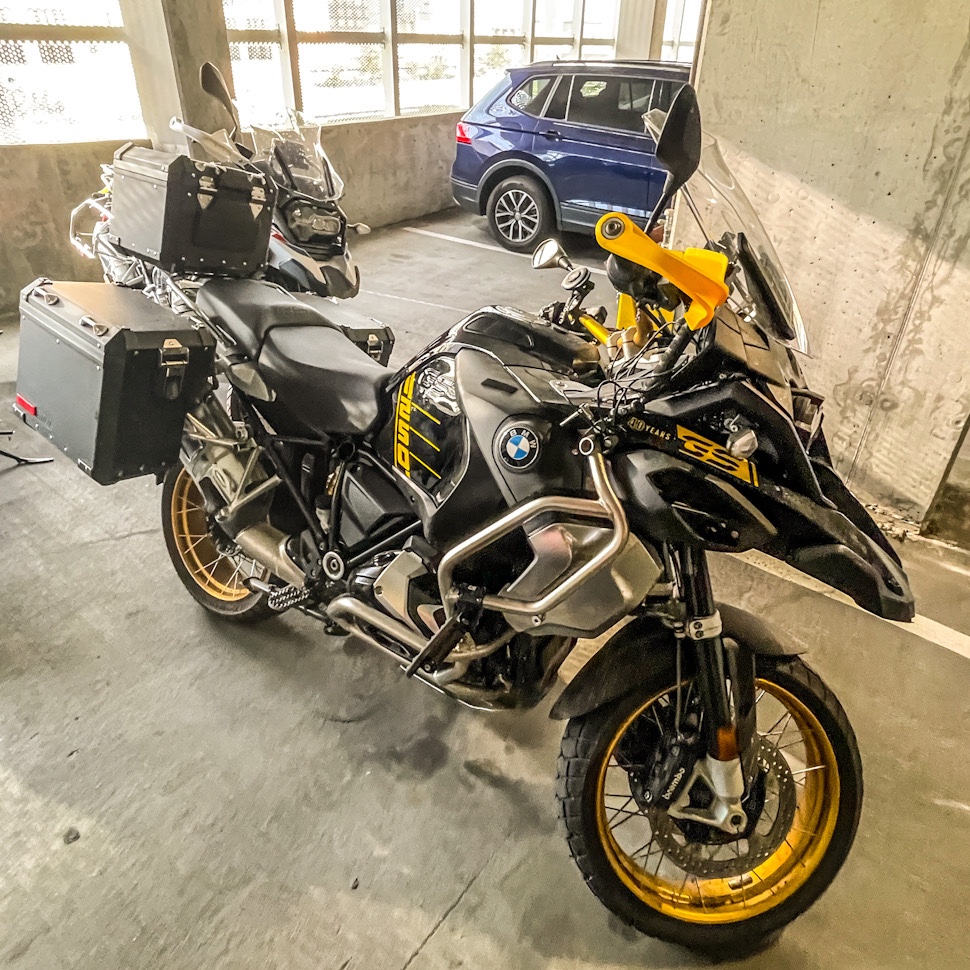 A pair of Beemer adventure bikes were parked next to my car. always like the black and yellow color scheme that is reminiscent of the original air cooler R90 GS from the late eighties.