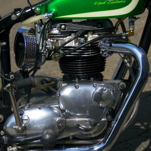 The pre unit engine from the mind of Edward Turner looks balanced and purposeful. Sweet in any frame be it a Triumph rigid or Norton featherbed. Here it’s a mechanics jewel.