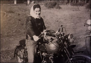 Bobber Gal: early days for a biker lass’ freedom. Headscarf keeps the hair in check when scooting along, leather jacket, denim. This 40’s Speed Twin with gently swept back ape bars a suitable steed for the day.