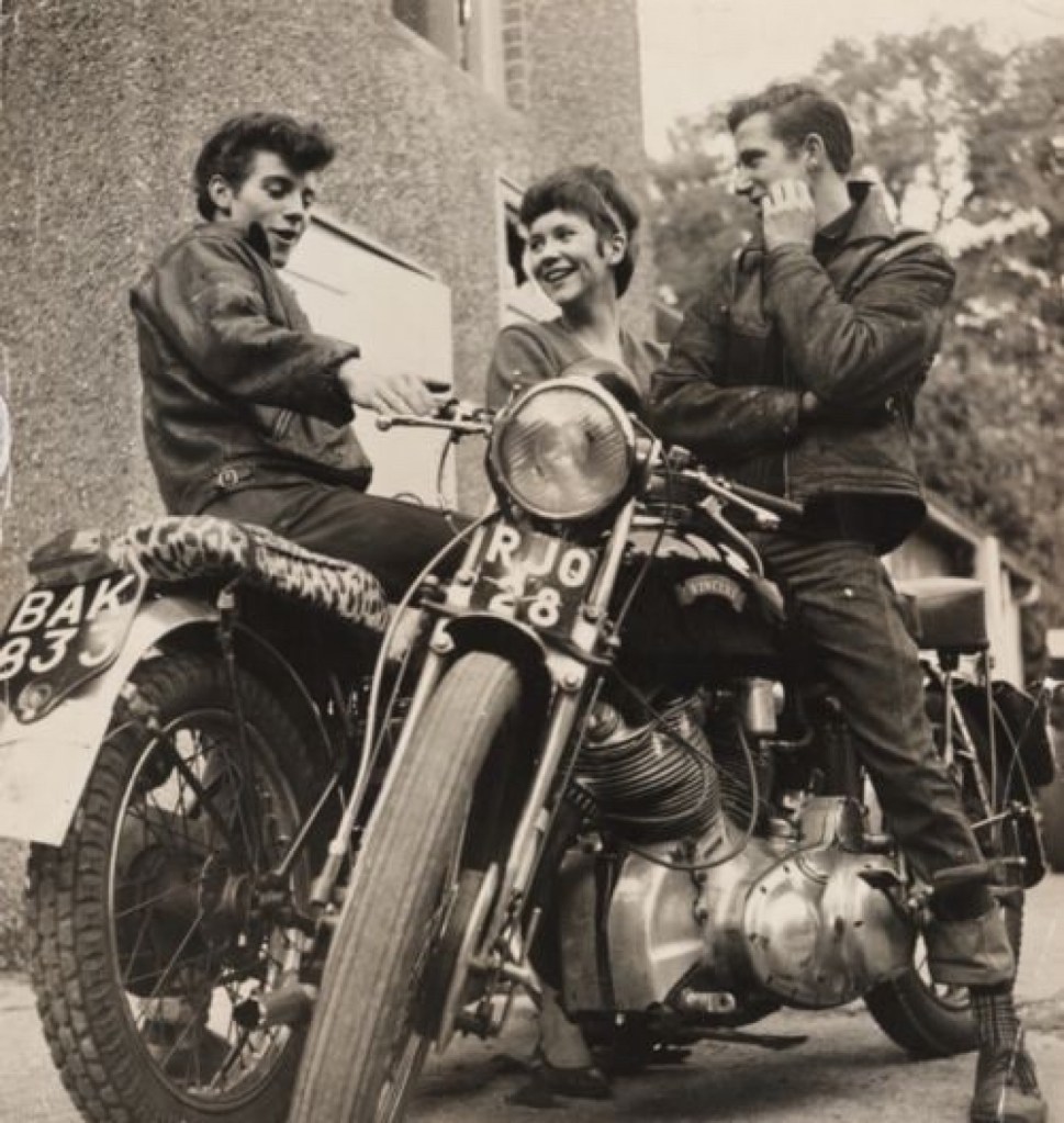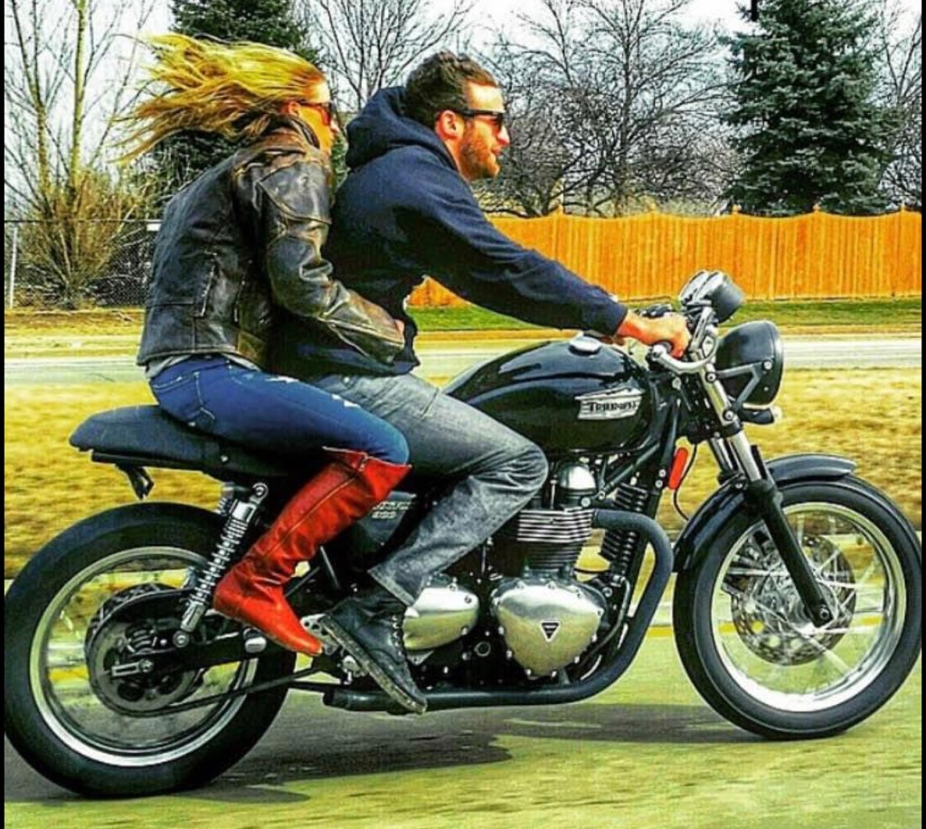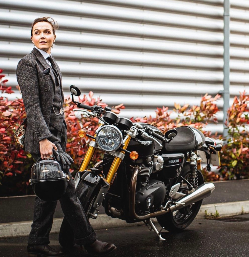 Cycling Olympian champion Victoria Pendleton CBE gives off a confident air in her three piece tweed suit. Perfect garb when standing over a black late model Triumph Thruxton.