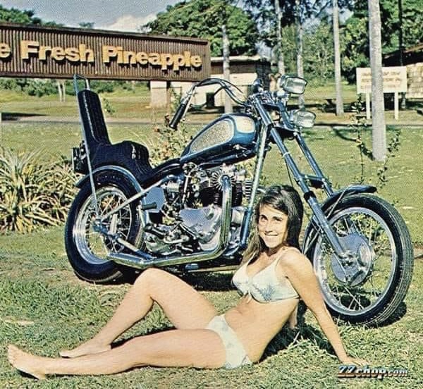 Hardtail chopper using a pre-unit Triumph motor is photographed like a prized possession. Bikini clad model says its two-wheeled summer fun ahead. Weather is improving here in the Midwest and a Sunday ride is planned. Pina Colada anyone?
