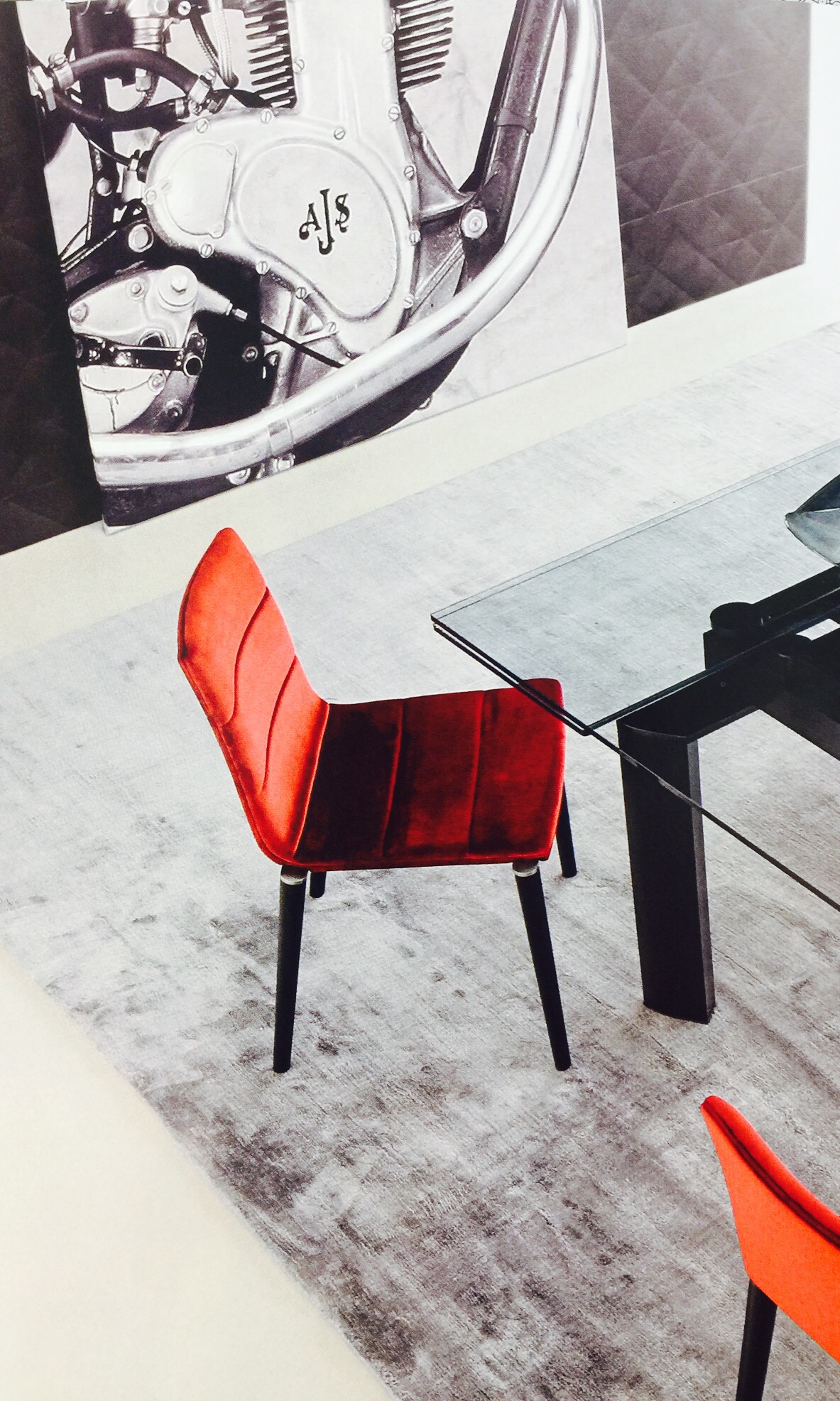 Idly flipping through an architectural journal today my eye made a double-take on a French furniture ad (RocheBobois). A wall sized photo canvas with the delightful lines of an AJS engine provided a perfect backdrop to their modern dining furniture. What beauty to behold.