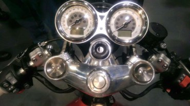 Named fender support fork brace, rubber bellow fork boots, twin clocks and a beautiful headlight offer a clean prow.