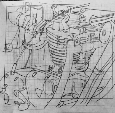 Grid – a quick doodle of the Triumph twin engine. I was waiting for the fish to cook, so took the 10 minutes to do this scrappy sketch on graph paper.