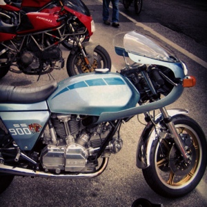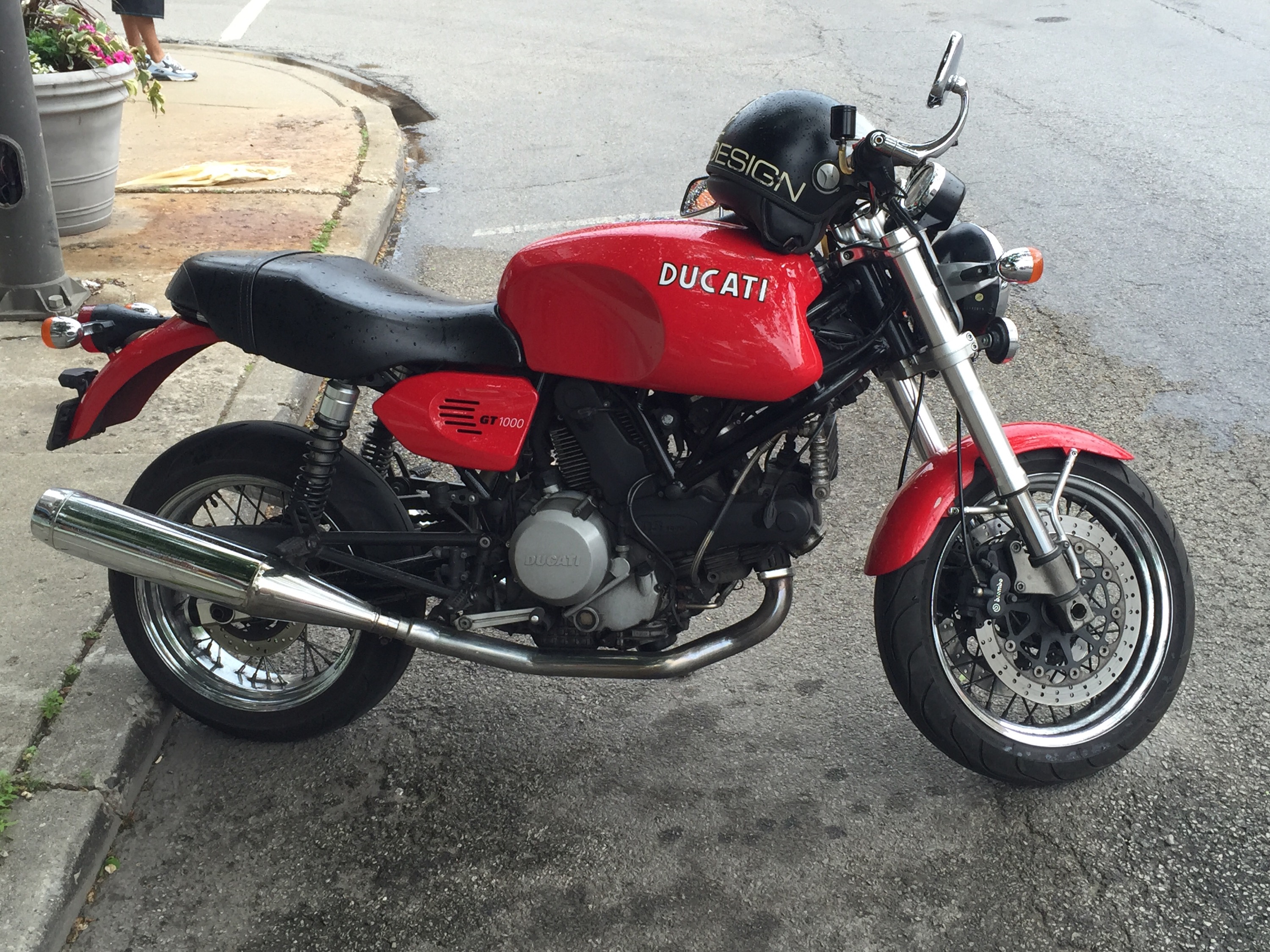 The Italians sure can make a pretty motorcycle. I was wandering around the block at work yesterday taking Geordie for a stroll and spied this red gem. Ducati’s GT 1000 Sport Classic. Based on the early 70’s Ducs it has a timeless quality very much like the Triumph Bonneville. If I wasn’t so into Meriden or Hinckley items this would be a suitable desire…