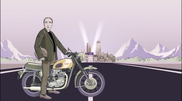 Vanishing Point- nice graphic used for a screenwriter school ad. Using Easy Rider as an example of ‘write your own movie!’ The artist uses a tweed garbed scholarly academian with a worried look about him riding into town on a classic Triumph Bonneville.