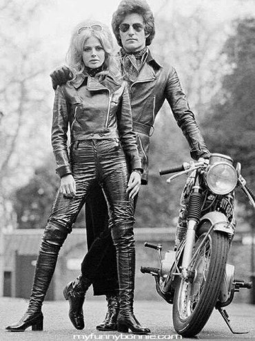 Stylin’! – Motorcycle clothing can ensure unqualified coolness; but make sure you have the hair-do, heels and neckscarf to compliment the look otherwise forget it! Cafe’d moto is a late Sixties Honda CB450 Black Bomber. Sunglasses are aviator. Silk cravat? Pure Carnaby Street…