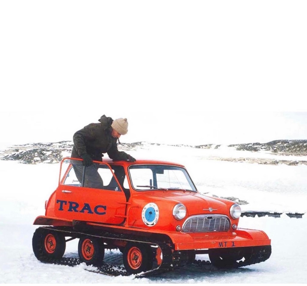 – an inventive sort has superbly winterized their Issigonis marvel. Bright orange in the whiteness of fresh snow. I need tracks like this for our Mini to navigate the alley.