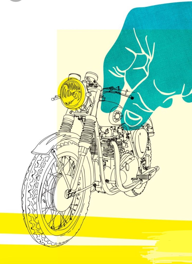 – a canvas, a rug, a plate, or a towel. BSA Rocket Goldstar in line with a swish of sunny yellow and turquoise screenprinted ‘Hand of God’.