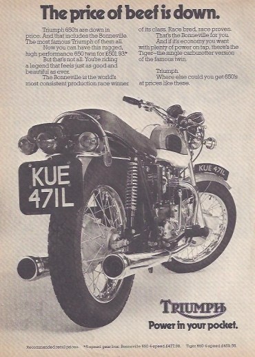 Beefy Bonnie – classy rear-end view of a 70’s Triumph. A magazine advert promoting the good price of this five speed model which at £501.93 or you could get the doughty Tiger for £459.56. For reference the weekly wage was £40 a week, a loaf of bread 10p, a pint? 25p.